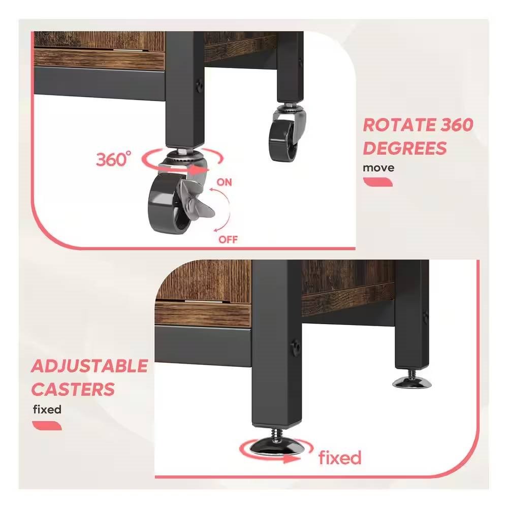 This Industrial Kitchen Metal Wood Bakers Rack Microwave Cart with Storage Cabinet can be as a coffee bar, microwave oven stand, bakers racks, plant stand, printer stand, bookshelf, storage console shelf,etc. 31.5" W x 14.57" D. The height can be adjusted from 45.2 inch to 54.6 inch. The large capacity cabinet, side bars and 3 tier shelves are enough for microwave oven, toaster, coffee maker, cups, dishes, dishcloth dry, etc. Wheels and adjustable screw-in feet can be chosen to install in different scenes. Convenient for your kitchen, living room, dining room, office, greenhouse, etc. Made of CARB certified P2 particle board, Bestier wood bakers racks for kitchens with storage has great stability and durability.