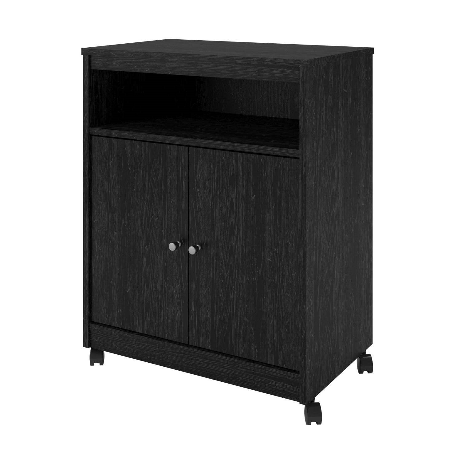 Dinner prep and kitchen storage just got easier, thanks to this Black Utility Cart / Kitchen Microwave Cart with Casters. Perfect in any kitchen, the cart is a kitchen utility unit that offers space for your microwave and many other items. Two cabinet doors open to a large storage area, ideal for keeping cereals, snacks, chips, bottled water and other foods. Or, use it to conceal your various serveware, plastic containers, lids and other items that usually clutter your countertops. An additional open compartment above the doors is perfect for placing bowls, cups and more. The kitchen utility cart is on wheels, making it easy to move around your space. Simply roll it out when you need and place it back against a wall when you're done. The cart is designed in a crisp black finish with solid metal handles, making it an attractive addition to any home. Easy to assemble with household tools.